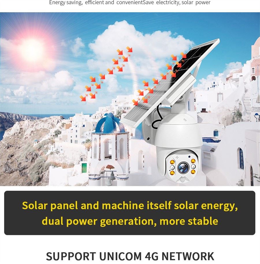 4. Amplificador Pan Tilt Broader View &; Control remot: la càmera solar ptz proporciona angles de visió de rotació horitzontal de 360° i vertical de 120°. Admet el control remot de la direcció al telèfon. Amb funcions de zoom digital 3x i compartició multiusuari, que ofereix una visió més flexible i més àmplia perquè tu i les famílies puguis controlar la teva casa en una visió global en temps real. Escollir una càmera solar exterior protegeix la teva llar les 24 hores del dia.